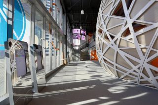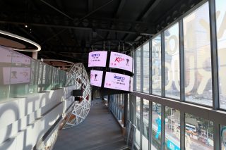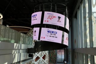 A set of P3 Flexible Spiral LED Wall is suspended from the ceiling, it looks like a cocoon hanging on a tree branch, tying in with the interior fitting-outd and the theme of "Emerging from a cocoon", which symbolizes change and transformation. Visitors can take selfies by using the Interactive Photo Booth Kiosks, different photos frame with against drug abuse slogans can be selected through the touch screens, and the photos will be displayed on the LED Wall afterwards.