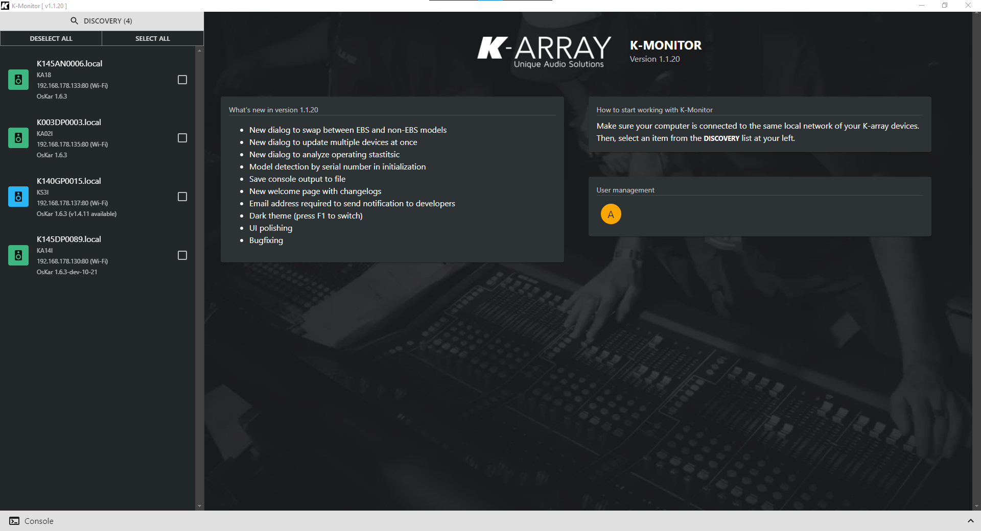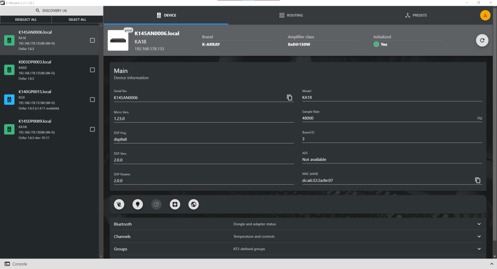 The software allows you to discover K-array products on the network and let performs health check and export of device presets. From MODEL DETECTION by serial number in initialization to UI POLISHING