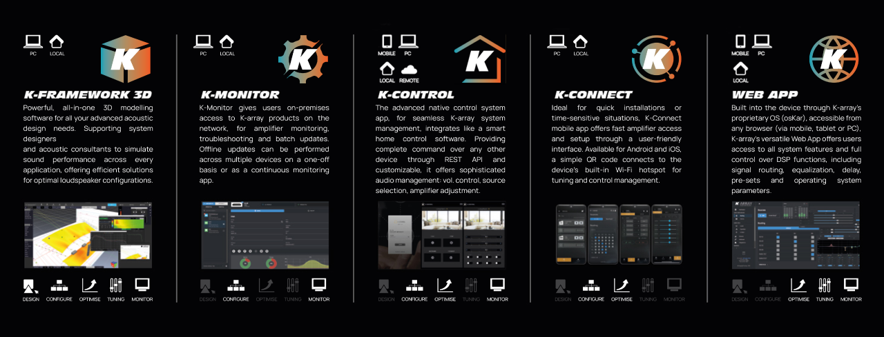 What truly sets K-array apart is its ecosystem approach. Each tool is designed for a specific stage of the project or type of user, yet they all connect seamlessly. Designers rely on K-Framework 3, installers configure zones via the Web App, venue managers adjust levels with K-Control, and support teams monitor systems through K-Cloud and K-Monitor—all within one integrated platform. By combining advanced acoustic modeling, flexible setup tools, intuitive control, and remote management, K-array’s software ecosystem empowers AV professionals to deliver exceptional sound experiences with confidence and clarity.